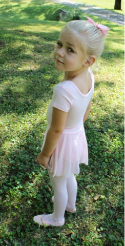 There were twelve little ballerinas all dressed just alike (except for the rainbow wonder below out of uniform). Below is Lydia doing the chasse, I believe. She also learned first position, how to pliƩ and curtsy, and other things I'm sure.